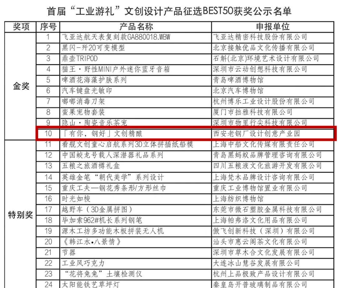 近日,工业和信息化部工业文化发展中心公布了首届“工业游礼”文创设计产品征选授奖决定,西安老钢厂设计创意产业园文创精酿「有你,钢好」夺得金奖。